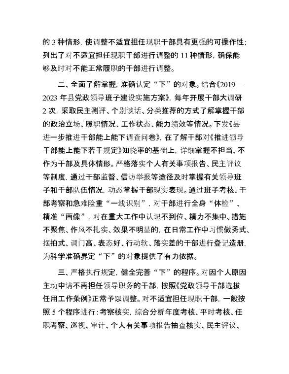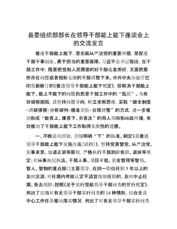 县委组织部部长在领导干部能上能下座谈会上的交流发言 2024-08-22 Word模板 97 购买前,请一定要先点击这里看看,欢迎持续关注,精彩模板每天推送 预览结束,本文件为word文档,一共4页,共1799字,请购买后,下载后查看 购买前,请一定要先点击这里看看,欢迎持续关注,精彩模板每天推送 资源下载下载价格59 RMBVIP免费升级VIP点击检测网盘有效后购买有任何充值和下载问题请加微信:xuexixuexi66 0 演讲发言