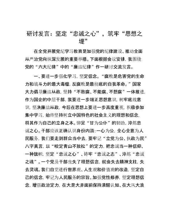研讨发言:坚定“忠诚之心”,筑牢“思想之堤” 2024-08-22 Word模板 104 购买前,请一定要先点击这里看看,欢迎持续关注,精彩模板每天推送 预览结束,本文件为word文档,一共3页,共1326字,请购买后,下载后查看 购买前,请一定要先点击这里看看,欢迎持续关注,精彩模板每天推送 资源下载下载价格59 RMBVIP免费升级VIP点击检测网盘有效后购买有任何充值和下载问题请加微信:xuexixuexi66 0 演讲发言