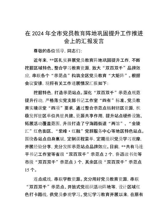在2024年全市党员教育阵地巩固提升工作推进会上的汇报发言 2024-08-22 Word模板 100 购买前,请一定要先点击这里看看,欢迎持续关注,精彩模板每天推送 预览结束,本文件为word文档,一共3页,共1206字,请购买后,下载后查看 购买前,请一定要先点击这里看看,欢迎持续关注,精彩模板每天推送 资源下载下载价格59 RMBVIP免费升级VIP点击检测网盘有效后购买有任何充值和下载问题请加微信:xuexixuexi66 0 演讲发言