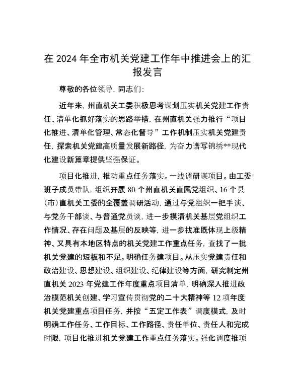 在2024年全市机关党建工作年中推进会上的汇报发言 2024-08-22 Word模板 102 购买前,请一定要先点击这里看看,欢迎持续关注,精彩模板每天推送 预览结束,本文件为word文档,一共4页,共1487字,请购买后,下载后查看 购买前,请一定要先点击这里看看,欢迎持续关注,精彩模板每天推送 资源下载下载价格59 RMBVIP免费升级VIP点击检测网盘有效后购买有任何充值和下载问题请加微信:xuexixuexi66 0 演讲发言