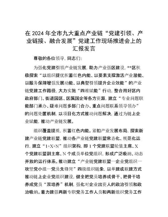 在2024年全市九大重点产业链“党建引领、产业链接、融合发展”党建工作现场推进会上的汇报发言 2024-08-22 Word模板 103 购买前,请一定要先点击这里看看,欢迎持续关注,精彩模板每天推送 预览结束,本文件为word文档,一共3页,共1409字,请购买后,下载后查看 购买前,请一定要先点击这里看看,欢迎持续关注,精彩模板每天推送 资源下载下载价格59 RMBVIP免费升级VIP点击检测网盘有效后购买有任何充值和下载问题请加微信:xuexixuexi66 0 演讲发言