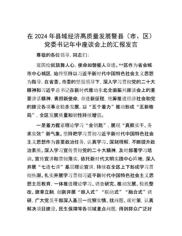 在2024年县域经济高质量发展暨县(市、区)党委书记年中座谈会上的汇报发言 2024-08-22 Word模板 105 购买前,请一定要先点击这里看看,欢迎持续关注,精彩模板每天推送 预览结束,本文件为word文档,一共5页,共2150字,请购买后,下载后查看 购买前,请一定要先点击这里看看,欢迎持续关注,精彩模板每天推送 资源下载下载价格59 RMBVIP免费升级VIP点击检测网盘有效后购买有任何充值和下载问题请加微信:xuexixuexi66 0 演讲发言