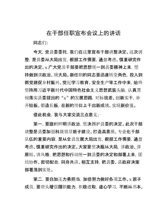 在干部任职宣布会议上的讲话 2024-08-22 Word模板 99 购买前,请一定要先点击这里看看,欢迎持续关注,精彩模板每天推送 预览结束,本文件为word文档,一共3页,共986字,请购买后,下载后查看 购买前,请一定要先点击这里看看,欢迎持续关注,精彩模板每天推送 资源下载下载价格59 RMBVIP免费升级VIP点击检测网盘有效后购买有任何充值和下载问题请加微信:xuexixuexi66 0 演讲发言