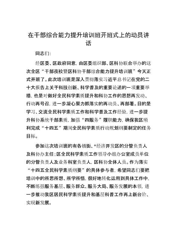 在干部综合能力提升培训班开班式上的动员讲话 2024-08-22 Word模板 107 购买前,请一定要先点击这里看看,欢迎持续关注,精彩模板每天推送 预览结束,本文件为word文档,一共4页,共1906字,请购买后,下载后查看 购买前,请一定要先点击这里看看,欢迎持续关注,精彩模板每天推送 资源下载下载价格59 RMBVIP免费升级VIP点击检测网盘有效后购买有任何充值和下载问题请加微信:xuexixuexi66 0 演讲发言