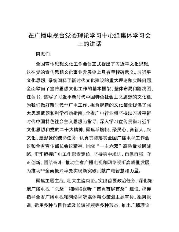 在广播电视台党委理论学习中心组集体学习会上的讲话 2024-08-22 Word模板 111 购买前,请一定要先点击这里看看,欢迎持续关注,精彩模板每天推送 预览结束,本文件为word文档,一共6页,共2933字,请购买后,下载后查看 购买前,请一定要先点击这里看看,欢迎持续关注,精彩模板每天推送 资源下载下载价格59 RMBVIP免费升级VIP点击检测网盘有效后购买有任何充值和下载问题请加微信:xuexixuexi66 0 演讲发言
