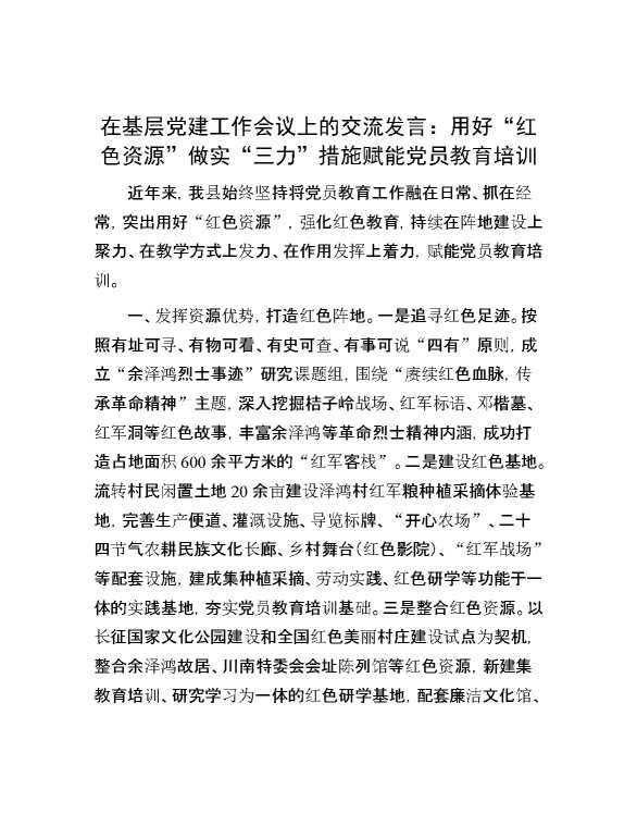 在基层党建工作会议上的交流发言:用好“红色资源” 做实“三力”措施赋能党员教育培训 2024-08-22 Word模板 112 购买前,请一定要先点击这里看看,欢迎持续关注,精彩模板每天推送 预览结束,本文件为word文档,一共3页,共1239字,请购买后,下载后查看 购买前,请一定要先点击这里看看,欢迎持续关注,精彩模板每天推送 资源下载下载价格59 RMBVIP免费升级VIP点击检测网盘有效后购买有任何充值和下载问题请加微信:xuexixuexi66 0 演讲发言