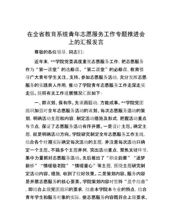 在全省教育系统青年志愿服务工作专题推进会上的汇报发言 2024-08-22 Word模板 109 购买前,请一定要先点击这里看看,欢迎持续关注,精彩模板每天推送 预览结束,本文件为word文档,一共6页,共2972字,请购买后,下载后查看 购买前,请一定要先点击这里看看,欢迎持续关注,精彩模板每天推送 资源下载下载价格59 RMBVIP免费升级VIP点击检测网盘有效后购买有任何充值和下载问题请加微信:xuexixuexi66 0 演讲发言