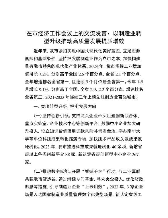 在市经济工作会议上的交流发言:以制造业转型升级推动高质量发展提质增效 2024-08-22 Word模板 106 购买前,请一定要先点击这里看看,欢迎持续关注,精彩模板每天推送 预览结束,本文件为word文档,一共6页,共2640字,请购买后,下载后查看 购买前,请一定要先点击这里看看,欢迎持续关注,精彩模板每天推送 资源下载下载价格59 RMBVIP免费升级VIP点击检测网盘有效后购买有任何充值和下载问题请加微信:xuexixuexi66 0 演讲发言