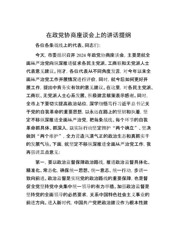 在政党协商座谈会上的讲话提纲 2024-08-22 Word模板 120 购买前,请一定要先点击这里看看,欢迎持续关注,精彩模板每天推送 预览结束,本文件为word文档,一共5页,共2292字,请购买后,下载后查看 购买前,请一定要先点击这里看看,欢迎持续关注,精彩模板每天推送 资源下载下载价格59 RMBVIP免费升级VIP点击检测网盘有效后购买有任何充值和下载问题请加微信:xuexixuexi66 0 演讲发言