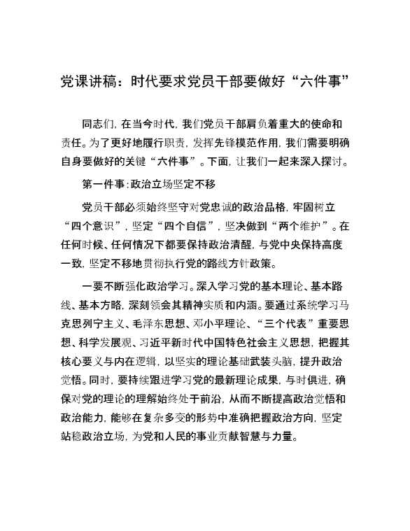 党课讲稿:时代要求党员干部要做好“六件事” 2024-08-22 Word模板 122 购买前,请一定要先点击这里看看,欢迎持续关注,精彩模板每天推送 预览结束,本文件为word文档,一共10页,共4732字,请购买后,下载后查看 购买前,请一定要先点击这里看看,欢迎持续关注,精彩模板每天推送 资源下载下载价格59 RMBVIP免费升级VIP点击检测网盘有效后购买有任何充值和下载问题请加微信:xuexixuexi66 0 党课及生活会