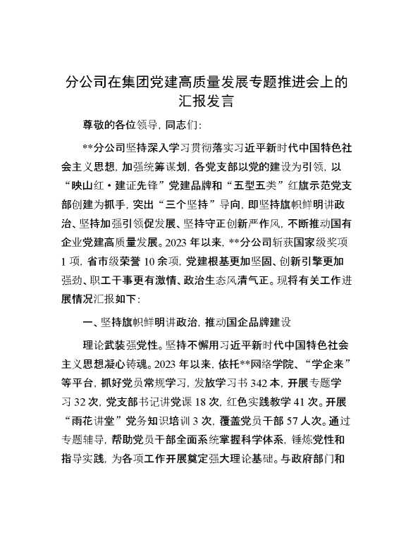 分公司在集团党建高质量发展专题推进会上的汇报发言 2024-09-02 Word模板 137 购买前,请一定要先点击这里看看,欢迎持续关注,精彩模板每天推送 预览结束,本文件为word文档,一共6页,共2543字,请购买后,下载后查看 购买前,请一定要先点击这里看看,欢迎持续关注,精彩模板每天推送 资源下载下载价格59 RMBVIP免费升级VIP点击检测网盘有效后购买有任何充值和下载问题请加微信:xuexixuexi66 0 演讲发言