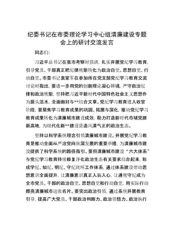 纪委书记在市委理论学习中心组清廉建设专题会上的研讨交流发言 2024-09-02 Word模板 94 购买前,请一定要先点击这里看看,欢迎持续关注,精彩模板每天推送 预览结束,本文件为word文档,一共4页,共1563字,请购买后,下载后查看 购买前,请一定要先点击这里看看,欢迎持续关注,精彩模板每天推送 资源下载下载价格59 RMBVIP免费升级VIP点击检测网盘有效后购买有任何充值和下载问题请加微信:xuexixuexi66 0 演讲发言