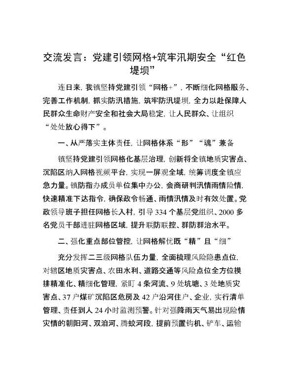 交流发言:党建引领网格+ 筑牢汛期安全“红色堤坝” 2024-09-02 Word模板 116 购买前,请一定要先点击这里看看,欢迎持续关注,精彩模板每天推送 预览结束,本文件为word文档,一共2页,共650字,请购买后,下载后查看 购买前,请一定要先点击这里看看,欢迎持续关注,精彩模板每天推送 资源下载下载价格59 RMBVIP免费升级VIP点击检测网盘有效后购买有任何充值和下载问题请加微信:xuexixuexi66 0 演讲发言