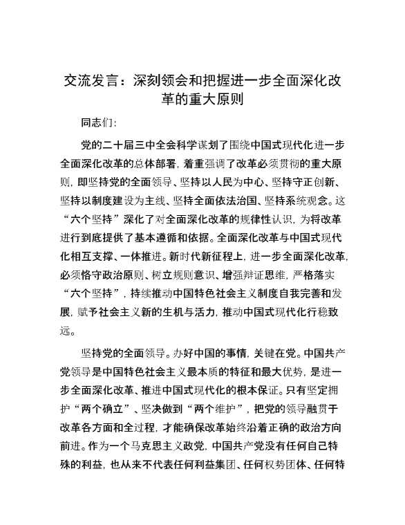 交流发言:深刻领会和把握进一步全面深化改革的重大原则 2024-09-02 Word模板 99 购买前,请一定要先点击这里看看,欢迎持续关注,精彩模板每天推送 预览结束,本文件为word文档,一共5页,共2459字,请购买后,下载后查看 购买前,请一定要先点击这里看看,欢迎持续关注,精彩模板每天推送 资源下载下载价格59 RMBVIP免费升级VIP点击检测网盘有效后购买有任何充值和下载问题请加微信:xuexixuexi66 0 演讲发言