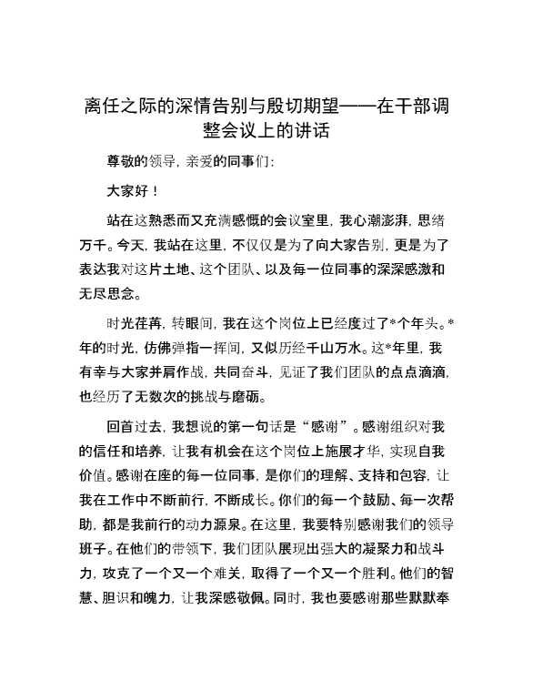 离任之际的深情告别与殷切期望——在干部调整会议上的讲话 2024-09-02 Word模板 98 购买前,请一定要先点击这里看看,欢迎持续关注,精彩模板每天推送 预览结束,本文件为word文档,一共3页,共1176字,请购买后,下载后查看 购买前,请一定要先点击这里看看,欢迎持续关注,精彩模板每天推送 资源下载下载价格59 RMBVIP免费升级VIP点击检测网盘有效后购买有任何充值和下载问题请加微信:xuexixuexi66 0 演讲发言