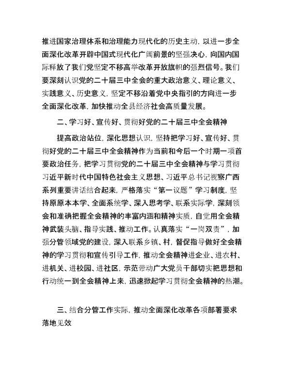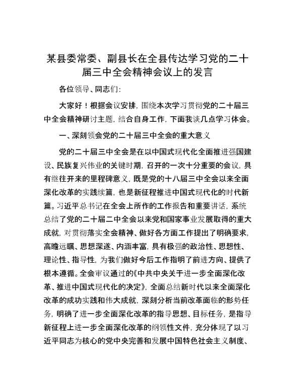某县委常委、副县长在全县传达学习党的二十届三中全会精神会议上的发言 2024-09-02 Word模板 111 购买前,请一定要先点击这里看看,欢迎持续关注,精彩模板每天推送 预览结束,本文件为word文档,一共4页,共1738字,请购买后,下载后查看 购买前,请一定要先点击这里看看,欢迎持续关注,精彩模板每天推送 资源下载下载价格59 RMBVIP免费升级VIP立即购买有任何充值和下载问题请加微信:xuexixuexi66 0 演讲发言