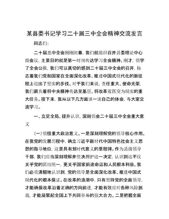 某县委书记学习二十届三中全会精神交流发言 2024-09-02 Word模板 111 购买前,请一定要先点击这里看看,欢迎持续关注,精彩模板每天推送 预览结束,本文件为word文档,一共8页,共4057字,请购买后,下载后查看 购买前,请一定要先点击这里看看,欢迎持续关注,精彩模板每天推送 资源下载下载价格59 RMBVIP免费升级VIP点击检测网盘有效后购买有任何充值和下载问题请加微信:xuexixuexi66 0 演讲发言