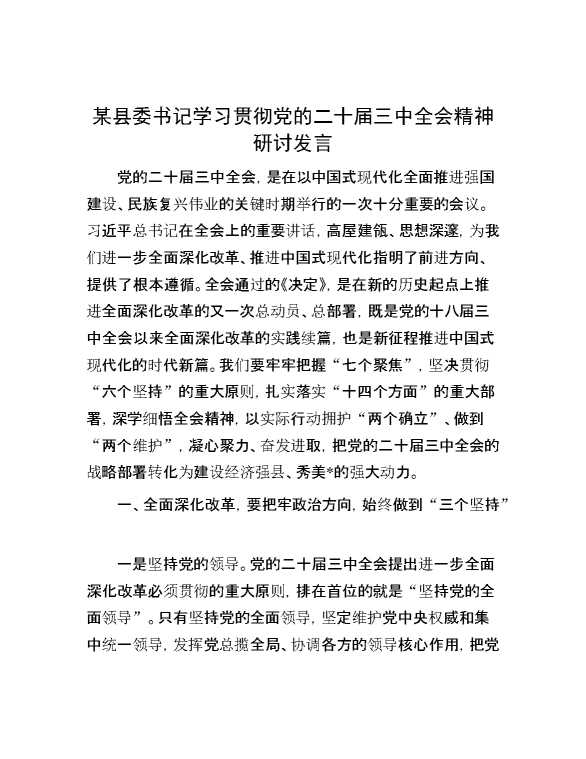 某县委书记学习贯彻党的二十届三中全会精神研讨发言 2024-09-02 Word模板 115 购买前,请一定要先点击这里看看,欢迎持续关注,精彩模板每天推送 预览结束,本文件为word文档,一共4页,共1824字,请购买后,下载后查看 购买前,请一定要先点击这里看看,欢迎持续关注,精彩模板每天推送 资源下载下载价格59 RMBVIP免费升级VIP点击检测网盘有效后购买有任何充值和下载问题请加微信:xuexixuexi66 0 演讲发言