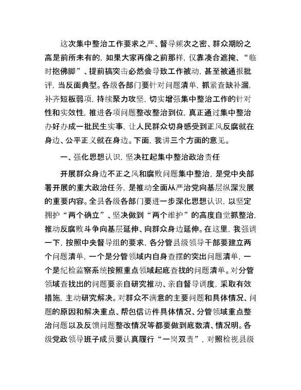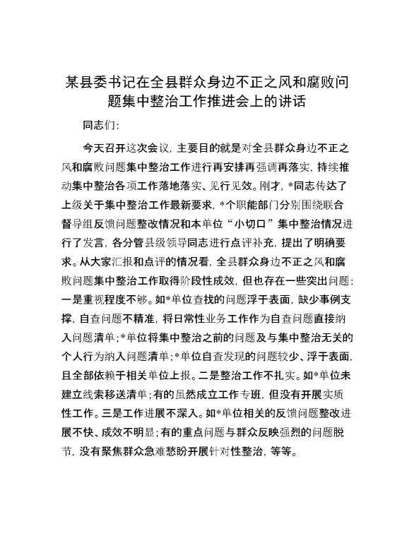 某县委书记在全县群众身边不正之风和腐败问题集中整治工作推进会上的讲话 2024-09-02 Word模板 117 购买前,请一定要先点击这里看看,欢迎持续关注,精彩模板每天推送 预览结束,本文件为word文档,一共5页,共2152字,请购买后,下载后查看 购买前,请一定要先点击这里看看,欢迎持续关注,精彩模板每天推送 资源下载下载价格59 RMBVIP免费升级VIP点击检测网盘有效后购买有任何充值和下载问题请加微信:xuexixuexi66 0 演讲发言