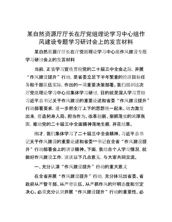 某自然资源厅厅长在厅党组理论学习中心组作风建设专题学习研讨会上的发言材料 2024-09-02 Word模板 108 购买前,请一定要先点击这里看看,欢迎持续关注,精彩模板每天推送 预览结束,本文件为word文档,一共8页,共3743字,请购买后,下载后查看 购买前,请一定要先点击这里看看,欢迎持续关注,精彩模板每天推送 资源下载下载价格59 RMBVIP免费升级VIP点击检测网盘有效后购买有任何充值和下载问题请加微信:xuexixuexi66 0 演讲发言