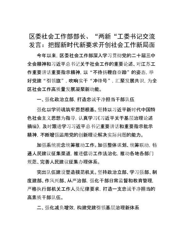 区委社会工作部部长、“两新“工委书记交流发言:把握新时代新要求 开创社会工作新局面 2024-09-02 Word模板 93 购买前,请一定要先点击这里看看,欢迎持续关注,精彩模板每天推送 预览结束,本文件为word文档,一共3页,共1227字,请购买后,下载后查看 购买前,请一定要先点击这里看看,欢迎持续关注,精彩模板每天推送 资源下载下载价格59 RMBVIP免费升级VIP点击检测网盘有效后购买有任何充值和下载问题请加微信:xuexixuexi66 0 演讲发言