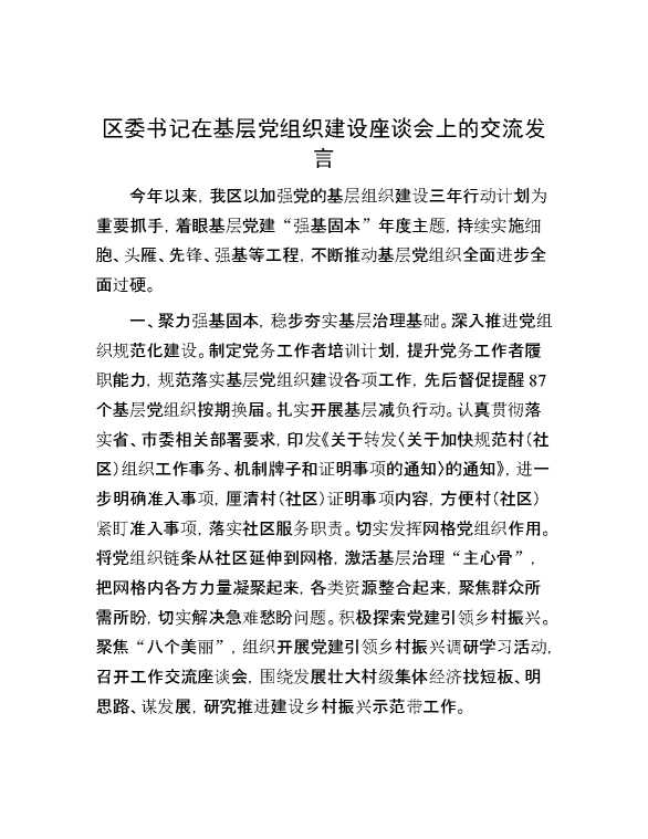 区委书记在基层党组织建设座谈会上的交流发言 2024-09-02 Word模板 106 购买前,请一定要先点击这里看看,欢迎持续关注,精彩模板每天推送 预览结束,本文件为word文档,一共3页,共1415字,请购买后,下载后查看 购买前,请一定要先点击这里看看,欢迎持续关注,精彩模板每天推送 资源下载下载价格59 RMBVIP免费升级VIP点击检测网盘有效后购买有任何充值和下载问题请加微信:xuexixuexi66 0 演讲发言