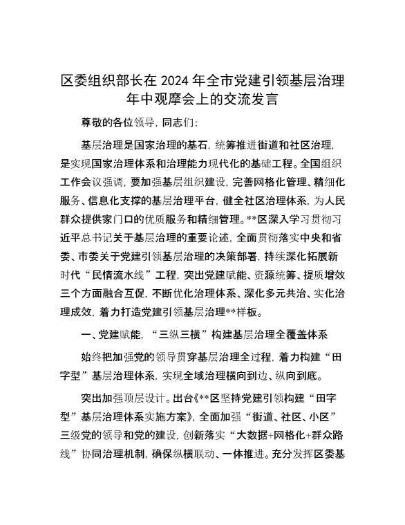 区委组织部长在2024年全市党建引领基层治理年中观摩会上的交流发言 2024-09-02 Word模板 87 购买前,请一定要先点击这里看看,欢迎持续关注,精彩模板每天推送 预览结束,本文件为word文档,一共6页,共2467字,请购买后,下载后查看 购买前,请一定要先点击这里看看,欢迎持续关注,精彩模板每天推送 资源下载下载价格59 RMBVIP免费升级VIP点击检测网盘有效后购买有任何充值和下载问题请加微信:xuexixuexi66 0 演讲发言
