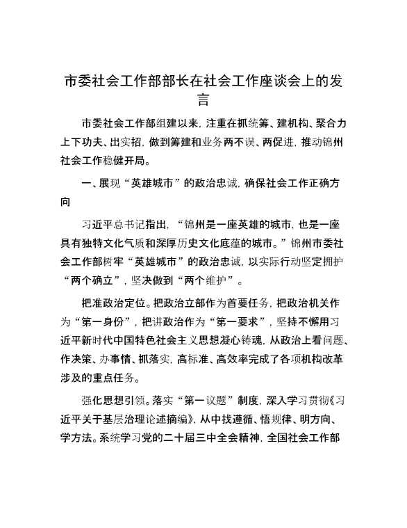 市委社会工作部部长在社会工作座谈会上的发言 2024-09-02 Word模板 100 购买前,请一定要先点击这里看看,欢迎持续关注,精彩模板每天推送 预览结束,本文件为word文档,一共4页,共1651字,请购买后,下载后查看 购买前,请一定要先点击这里看看,欢迎持续关注,精彩模板每天推送 资源下载下载价格59 RMBVIP免费升级VIP点击检测网盘有效后购买有任何充值和下载问题请加微信:xuexixuexi66 0 演讲发言