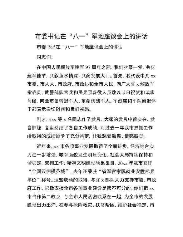 市委书记在“八一”军地座谈会上的讲话 2024-09-02 Word模板 114 购买前,请一定要先点击这里看看,欢迎持续关注,精彩模板每天推送 预览结束,本文件为word文档,一共5页,共2454字,请购买后,下载后查看 购买前,请一定要先点击这里看看,欢迎持续关注,精彩模板每天推送 资源下载下载价格59 RMBVIP免费升级VIP点击检测网盘有效后购买有任何充值和下载问题请加微信:xuexixuexi66 0 演讲发言