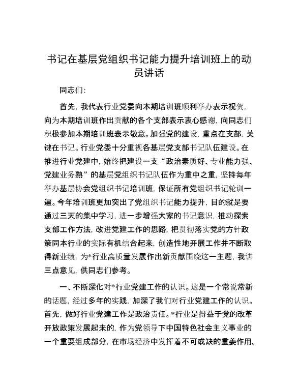 书记在基层党组织书记能力提升培训班上的动员讲话 2024-09-02 Word模板 90 购买前,请一定要先点击这里看看,欢迎持续关注,精彩模板每天推送 预览结束,本文件为word文档,一共6页,共3072字,请购买后,下载后查看 购买前,请一定要先点击这里看看,欢迎持续关注,精彩模板每天推送 资源下载下载价格59 RMBVIP免费升级VIP点击检测网盘有效后购买有任何充值和下载问题请加微信:xuexixuexi66 0 演讲发言