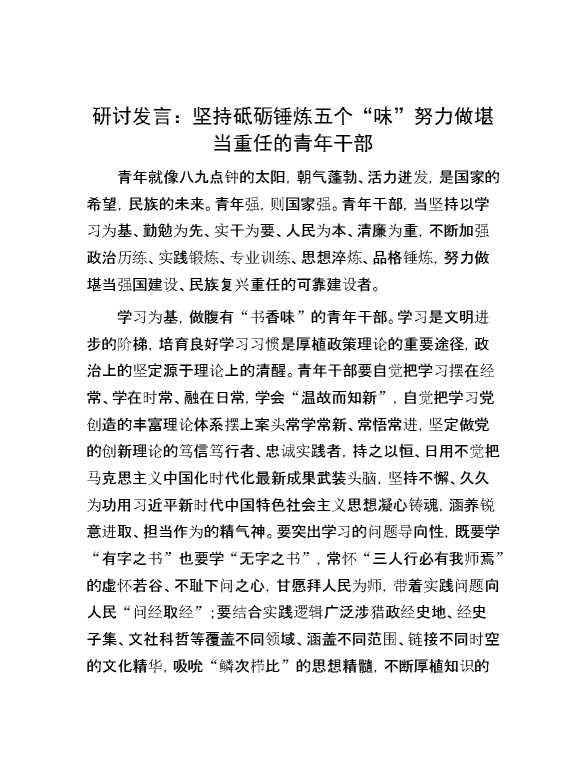 研讨发言:坚持砥砺锤炼五个“味” 努力做堪当重任的青年干部 2024-09-02 Word模板 91 购买前,请一定要先点击这里看看,欢迎持续关注,精彩模板每天推送 预览结束,本文件为word文档,一共5页,共2098字,请购买后,下载后查看 购买前,请一定要先点击这里看看,欢迎持续关注,精彩模板每天推送 资源下载下载价格59 RMBVIP免费升级VIP点击检测网盘有效后购买有任何充值和下载问题请加微信:xuexixuexi66 0 演讲发言