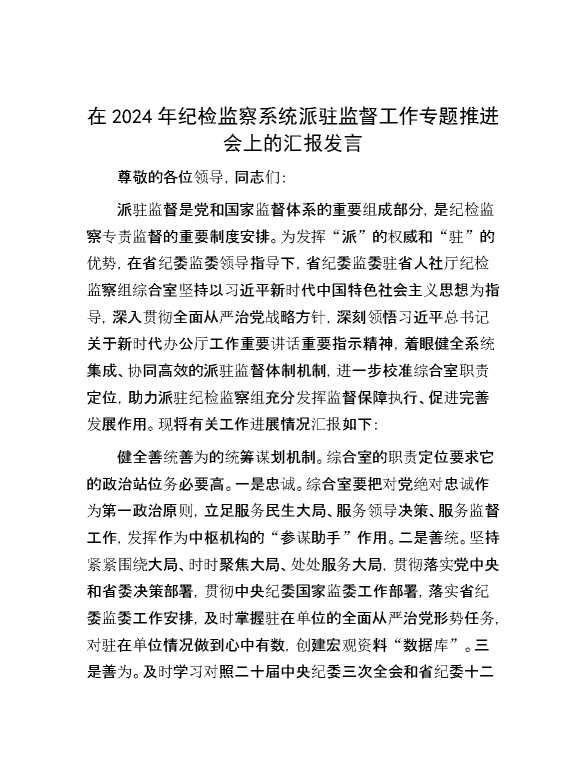 在2024年纪检监察系统派驻监督工作专题推进会上的汇报发言 2024-09-02 Word模板 77 购买前,请一定要先点击这里看看,欢迎持续关注,精彩模板每天推送 预览结束,本文件为word文档,一共4页,共2000字,请购买后,下载后查看 购买前,请一定要先点击这里看看,欢迎持续关注,精彩模板每天推送 资源下载下载价格59 RMBVIP免费升级VIP点击检测网盘有效后购买有任何充值和下载问题请加微信:xuexixuexi66 0 演讲发言