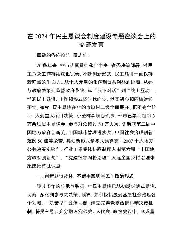 在2024年民主恳谈会制度建设专题座谈会上的交流发言 2024-09-02 Word模板 83 购买前,请一定要先点击这里看看,欢迎持续关注,精彩模板每天推送 预览结束,本文件为word文档,一共5页,共2596字,请购买后,下载后查看 购买前,请一定要先点击这里看看,欢迎持续关注,精彩模板每天推送 资源下载下载价格59 RMBVIP免费升级VIP点击检测网盘有效后购买有任何充值和下载问题请加微信:xuexixuexi66 0 演讲发言