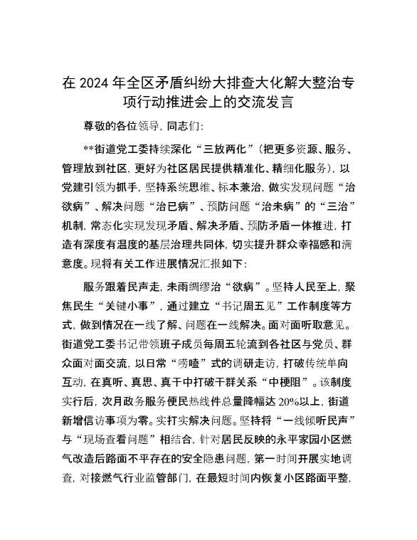 在2024年全区矛盾纠纷大排查大化解大整治专项行动推进会上的交流发言 2024-09-02 Word模板 78 购买前,请一定要先点击这里看看,欢迎持续关注,精彩模板每天推送 预览结束,本文件为word文档,一共3页,共1446字,请购买后,下载后查看 购买前,请一定要先点击这里看看,欢迎持续关注,精彩模板每天推送 资源下载下载价格59 RMBVIP免费升级VIP点击检测网盘有效后购买有任何充值和下载问题请加微信:xuexixuexi66 0 演讲发言