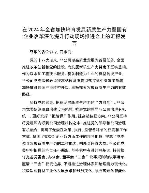 在2024年全省加快培育发展新质生产力暨国有企业改革深化提升行动现场推进会上的汇报发言 2024-09-02 Word模板 81 购买前,请一定要先点击这里看看,欢迎持续关注,精彩模板每天推送 预览结束,本文件为word文档,一共5页,共2246字,请购买后,下载后查看 购买前,请一定要先点击这里看看,欢迎持续关注,精彩模板每天推送 资源下载下载价格59 RMBVIP免费升级VIP点击检测网盘有效后购买有任何充值和下载问题请加微信:xuexixuexi66 0 演讲发言