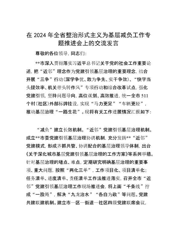 在2024年全省整治形式主义为基层减负工作专题推进会上的交流发言 2024-09-02 Word模板 87 购买前,请一定要先点击这里看看,欢迎持续关注,精彩模板每天推送 预览结束,本文件为word文档,一共5页,共2059字,请购买后,下载后查看 购买前,请一定要先点击这里看看,欢迎持续关注,精彩模板每天推送 资源下载下载价格59 RMBVIP免费升级VIP点击检测网盘有效后购买有任何充值和下载问题请加微信:xuexixuexi66 0 演讲发言