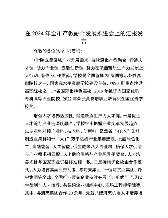 在2024年全市产教融合发展推进会上的汇报发言 2024-09-02 Word模板 76 购买前,请一定要先点击这里看看,欢迎持续关注,精彩模板每天推送 预览结束,本文件为word文档,一共4页,共1662字,请购买后,下载后查看 购买前,请一定要先点击这里看看,欢迎持续关注,精彩模板每天推送 资源下载下载价格59 RMBVIP免费升级VIP立即购买有任何充值和下载问题请加微信:xuexixuexi66 0 演讲发言