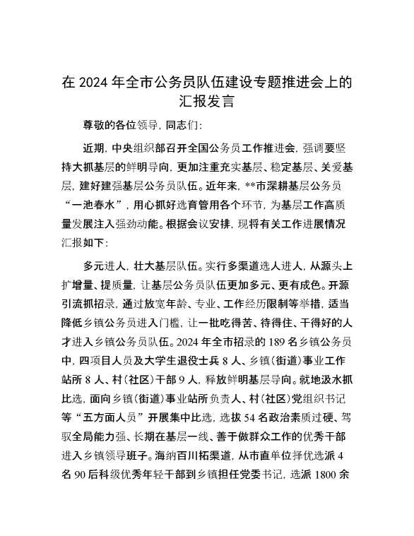 在2024年全市公务员队伍建设专题推进会上的汇报发言 2024-09-02 Word模板 90 购买前,请一定要先点击这里看看,欢迎持续关注,精彩模板每天推送 预览结束,本文件为word文档,一共5页,共2107字,请购买后,下载后查看 购买前,请一定要先点击这里看看,欢迎持续关注,精彩模板每天推送 资源下载下载价格59 RMBVIP免费升级VIP点击检测网盘有效后购买有任何充值和下载问题请加微信:xuexixuexi66 0 演讲发言