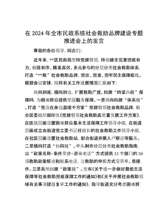 在2024年全市民政系统社会救助品牌建设专题推进会上的发言 2024-09-02 Word模板 83 购买前,请一定要先点击这里看看,欢迎持续关注,精彩模板每天推送 预览结束,本文件为word文档,一共3页,共1306字,请购买后,下载后查看 购买前,请一定要先点击这里看看,欢迎持续关注,精彩模板每天推送 资源下载下载价格59 RMBVIP免费升级VIP点击检测网盘有效后购买有任何充值和下载问题请加微信:xuexixuexi66 0 演讲发言