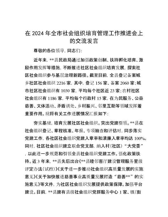 在2024年全市社会组织培育管理工作推进会上的交流发言 2024-09-02 Word模板 77 购买前,请一定要先点击这里看看,欢迎持续关注,精彩模板每天推送 预览结束,本文件为word文档,一共3页,共1370字,请购买后,下载后查看 购买前,请一定要先点击这里看看,欢迎持续关注,精彩模板每天推送 资源下载下载价格59 RMBVIP免费升级VIP点击检测网盘有效后购买有任何充值和下载问题请加微信:xuexixuexi66 0 演讲发言