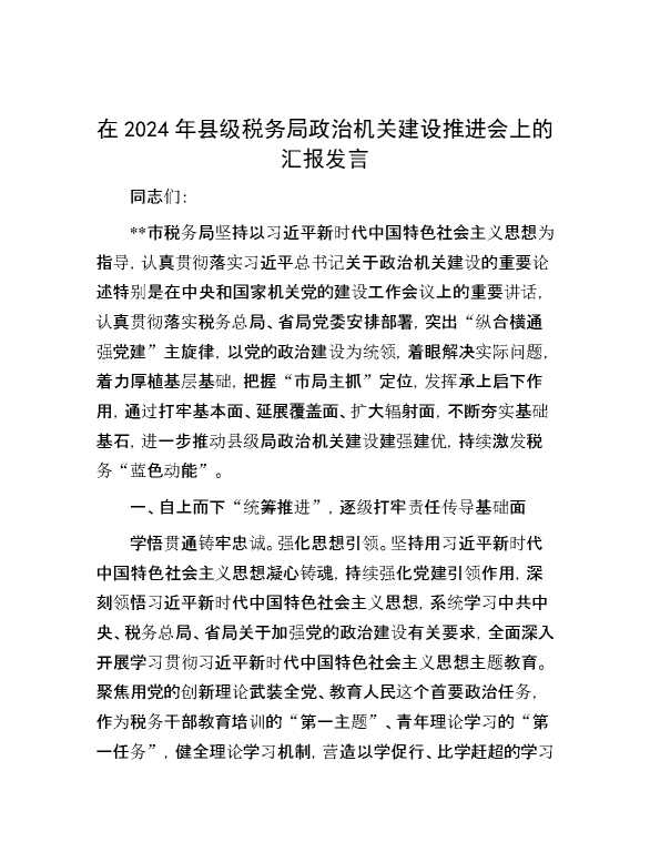 在2024年县级税务局政治机关建设推进会上的汇报发言 2024-09-02 Word模板 92 购买前,请一定要先点击这里看看,欢迎持续关注,精彩模板每天推送 预览结束,本文件为word文档,一共8页,共4051字,请购买后,下载后查看 购买前,请一定要先点击这里看看,欢迎持续关注,精彩模板每天推送 资源下载下载价格59 RMBVIP免费升级VIP点击检测网盘有效后购买有任何充值和下载问题请加微信:xuexixuexi66 0 演讲发言