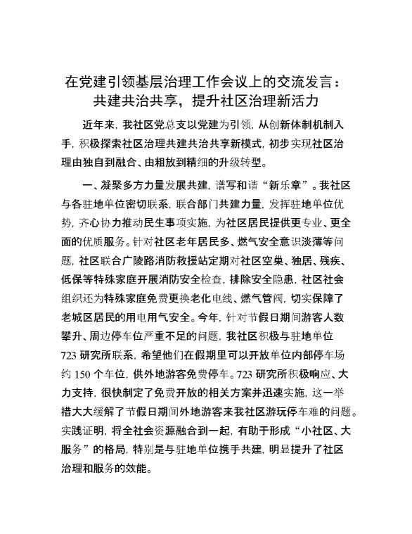 在党建引领基层治理工作会议上的交流发言:共建共治共享,提升社区治理新活力 2024-09-02 Word模板 83 购买前,请一定要先点击这里看看,欢迎持续关注,精彩模板每天推送 预览结束,本文件为word文档,一共3页,共1494字,请购买后,下载后查看 购买前,请一定要先点击这里看看,欢迎持续关注,精彩模板每天推送 资源下载下载价格59 RMBVIP免费升级VIP点击检测网盘有效后购买有任何充值和下载问题请加微信:xuexixuexi66 0 演讲发言