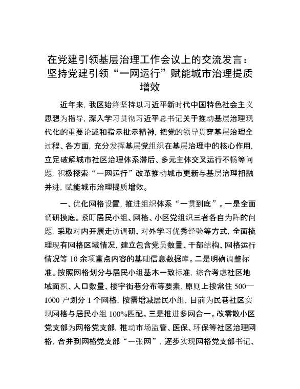 在党建引领基层治理工作会议上的交流发言:坚持党建引领“一网运行” 赋能城市治理提质增效 2024-09-02 Word模板 75 购买前,请一定要先点击这里看看,欢迎持续关注,精彩模板每天推送 预览结束,本文件为word文档,一共3页,共1166字,请购买后,下载后查看 购买前,请一定要先点击这里看看,欢迎持续关注,精彩模板每天推送 资源下载下载价格59 RMBVIP免费升级VIP点击检测网盘有效后购买有任何充值和下载问题请加微信:xuexixuexi66 0 演讲发言