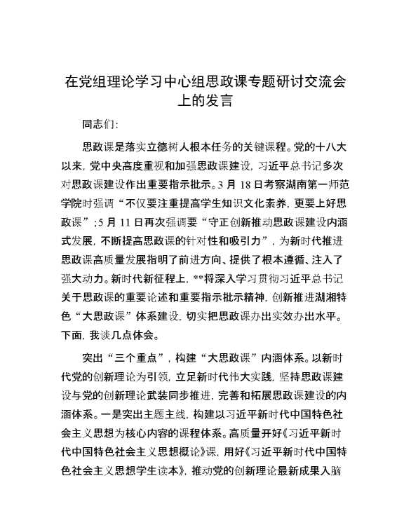在党组理论学习中心组思政课专题研讨交流会上的发言 2024-09-02 Word模板 77 购买前,请一定要先点击这里看看,欢迎持续关注,精彩模板每天推送 预览结束,本文件为word文档,一共5页,共2315字,请购买后,下载后查看 购买前,请一定要先点击这里看看,欢迎持续关注,精彩模板每天推送 资源下载下载价格59 RMBVIP免费升级VIP点击检测网盘有效后购买有任何充值和下载问题请加微信:xuexixuexi66 0 演讲发言