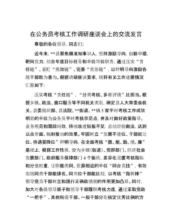 在公务员考核工作调研座谈会上的交流发言 2024-09-02 Word模板 72 购买前,请一定要先点击这里看看,欢迎持续关注,精彩模板每天推送 预览结束,本文件为word文档,一共3页,共1092字,请购买后,下载后查看 购买前,请一定要先点击这里看看,欢迎持续关注,精彩模板每天推送 资源下载下载价格59 RMBVIP免费升级VIP点击检测网盘有效后购买有任何充值和下载问题请加微信:xuexixuexi66 0 演讲发言
