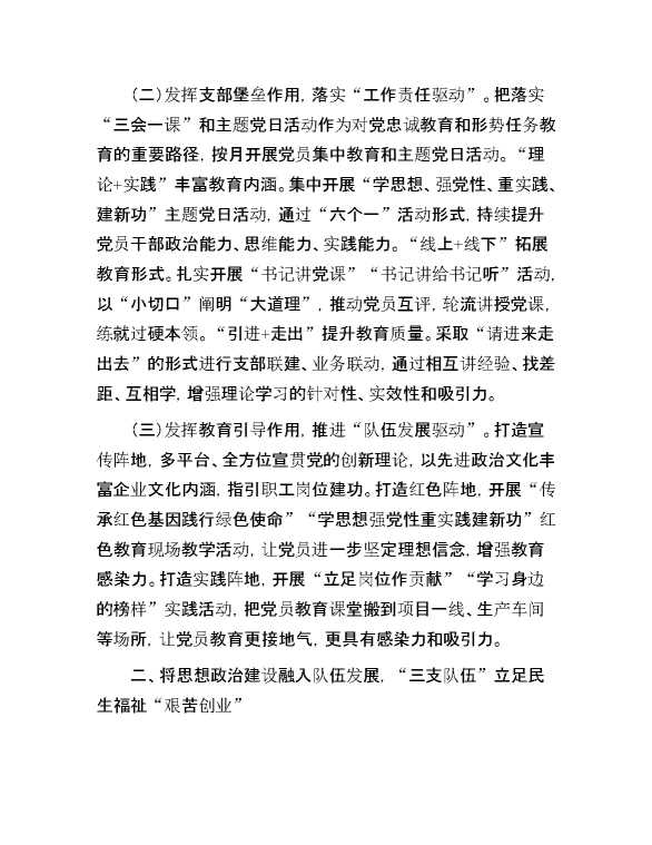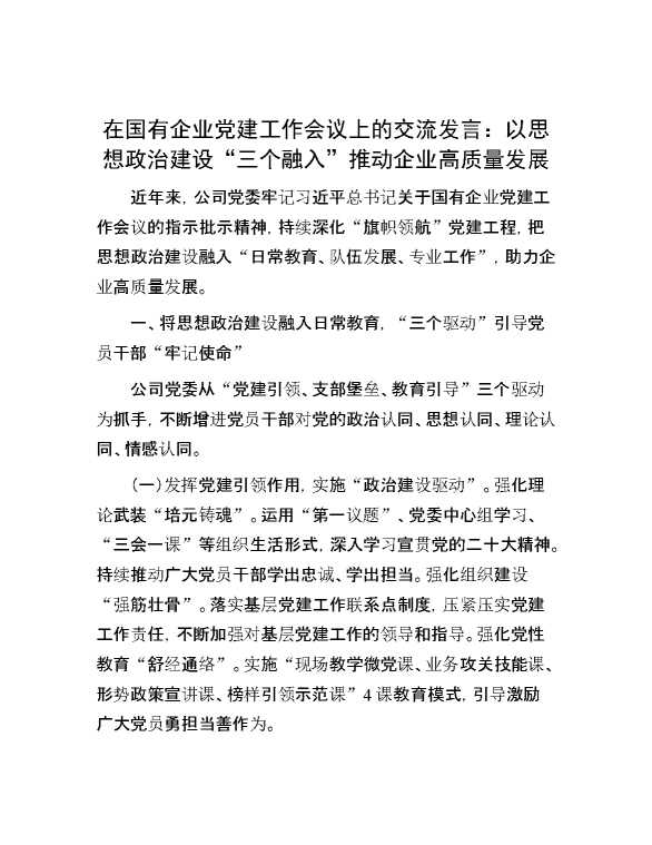 在国有企业党建工作会议上的交流发言:以思想政治建设“三个融入”推动企业高质量发展 2024-09-02 Word模板 81 购买前,请一定要先点击这里看看,欢迎持续关注,精彩模板每天推送 预览结束,本文件为word文档,一共5页,共2165字,请购买后,下载后查看 购买前,请一定要先点击这里看看,欢迎持续关注,精彩模板每天推送 资源下载下载价格59 RMBVIP免费升级VIP点击检测网盘有效后购买有任何充值和下载问题请加微信:xuexixuexi66 0 演讲发言