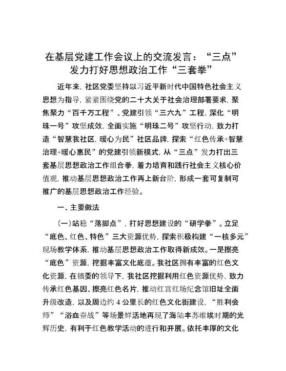 在基层党建工作会议上的交流发言:“三点”发力打好思想政治工作“三套拳” 2024-09-02 Word模板 74 购买前,请一定要先点击这里看看,欢迎持续关注,精彩模板每天推送 预览结束,本文件为word文档,一共7页,共3430字,请购买后,下载后查看 购买前,请一定要先点击这里看看,欢迎持续关注,精彩模板每天推送 资源下载下载价格59 RMBVIP免费升级VIP点击检测网盘有效后购买有任何充值和下载问题请加微信:xuexixuexi66 0 演讲发言