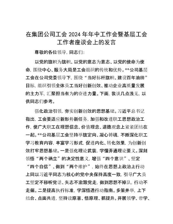 在集团公司工会2024年年中工作会暨基层工会工作者座谈会上的发言 2024-09-02 Word模板 78 购买前,请一定要先点击这里看看,欢迎持续关注,精彩模板每天推送 预览结束,本文件为word文档,一共4页,共1958字,请购买后,下载后查看 购买前,请一定要先点击这里看看,欢迎持续关注,精彩模板每天推送 资源下载下载价格59 RMBVIP免费升级VIP点击检测网盘有效后购买有任何充值和下载问题请加微信:xuexixuexi66 0 演讲发言