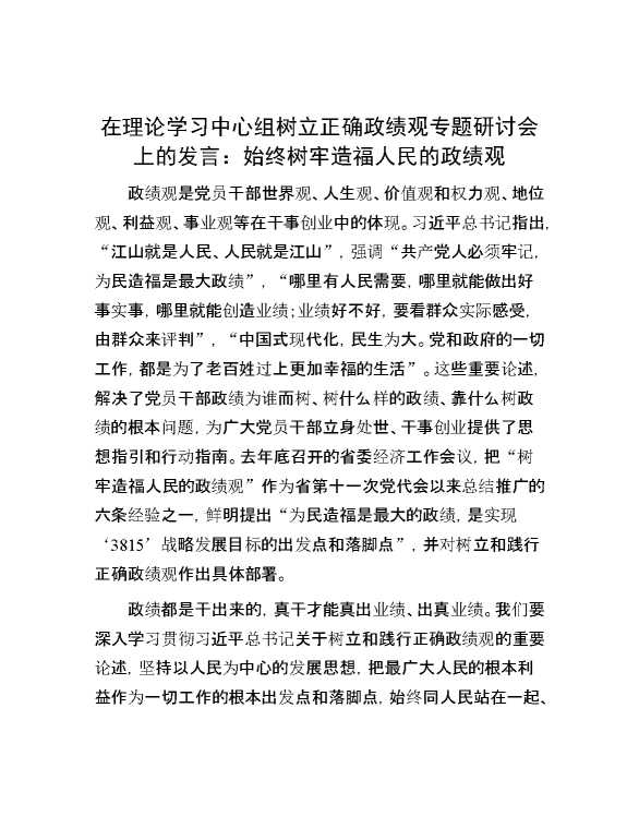 在理论学习中心组树立正确政绩观专题研讨会上的发言:始终树牢造福人民的政绩观 2024-09-02 Word模板 92 购买前,请一定要先点击这里看看,欢迎持续关注,精彩模板每天推送 预览结束,本文件为word文档,一共4页,共1952字,请购买后,下载后查看 购买前,请一定要先点击这里看看,欢迎持续关注,精彩模板每天推送 资源下载下载价格59 RMBVIP免费升级VIP点击检测网盘有效后购买有任何充值和下载问题请加微信:xuexixuexi66 0 演讲发言