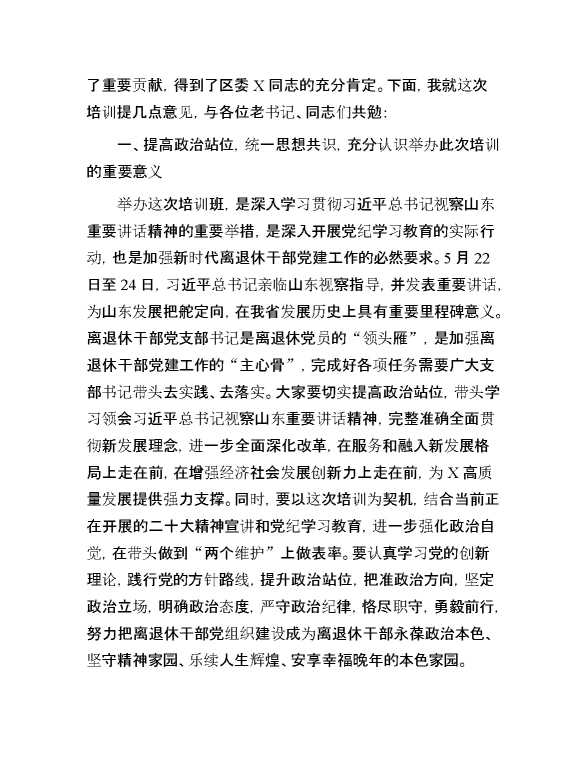 在全区离退休干部党组织书记培训班上的讲话提纲 2024-09-02 Word模板 79 购买前,请一定要先点击这里看看,欢迎持续关注,精彩模板每天推送 预览结束,本文件为word文档,一共6页,共2776字,请购买后,下载后查看 购买前,请一定要先点击这里看看,欢迎持续关注,精彩模板每天推送 资源下载下载价格59 RMBVIP免费升级VIP点击检测网盘有效后购买有任何充值和下载问题请加微信:xuexixuexi66 0 演讲发言